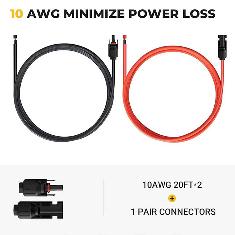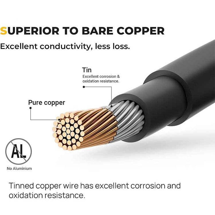 Minimaliseer kragverlies: Gemaak met tin-bedekte suiwer cooper, die tin-bedekte suiwer cooper-kabel het goeie elektriese geleidingsvermoë, in vergelyking met kaal koperdraad, sy korrosieweerstand en oksidasieprestasie is sterker, kan ook die lewensduur van kabels aansienlik verleng. In vergelyking met 14AWG- en 12AWG-kabels, kan die gebruik van 'n 10AWG-sonkragverlengingskabel kragverlies in jou sonpaneelstelsel verminder.