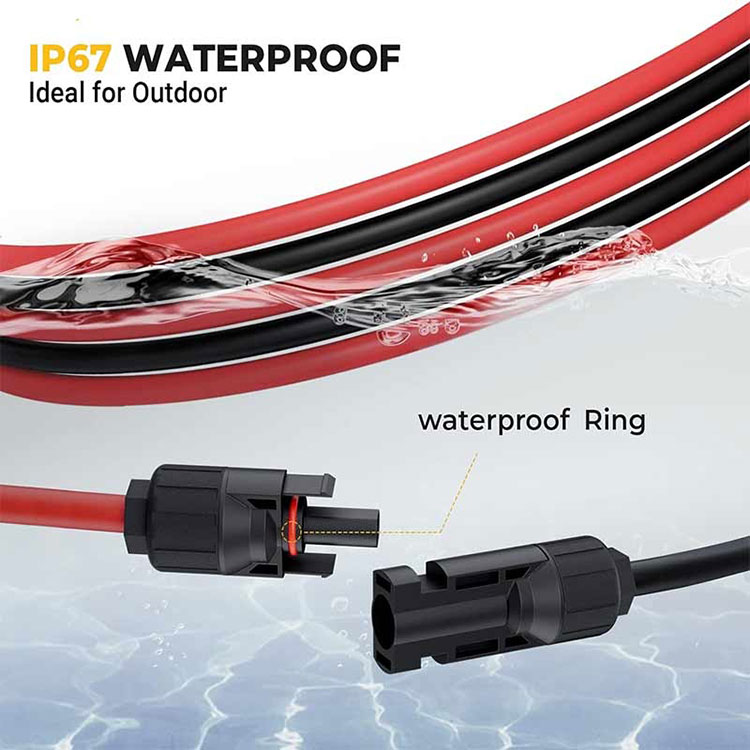 Waterdig en duursaam: 'n IP67 waterdigte ring op die manlike sonkragverbinding is perfek om water en stof uit te verseël om korrosie te voorkom. Die koppelstuk is stabiel en veilig met die ingeboude slot, wat duursaam is buite. Die PV-kabel is ontwerp om uiterste hitte en koue te weerstaan.